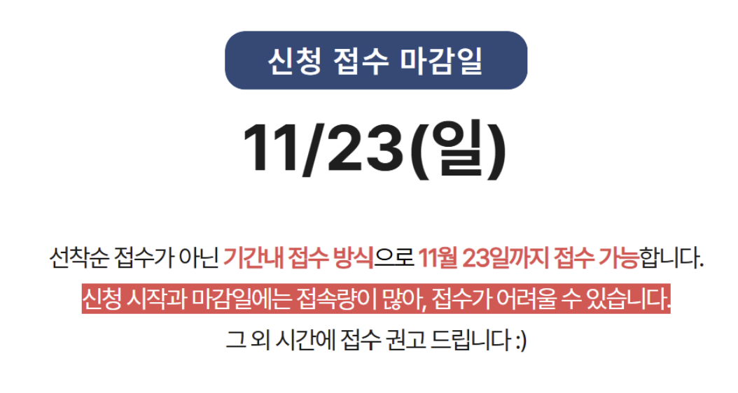 - 마감일 직전에는 접수량 폭주로 홈페이지가 느려질 수 있으므로 11월 중순 이전 신청을 권장드립니다.